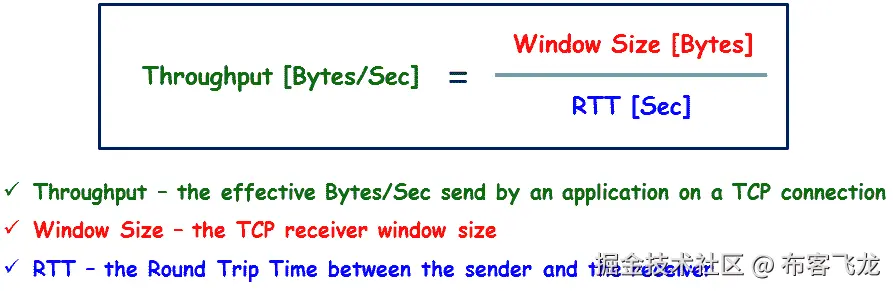 - 增大接收方窗口大小会告诉发送方增加吞吐量,而减小接收方窗口大小会告诉发送方减少吞吐量。它根据以下 WS/RTT 规则工作(根据 TCP 版本有一些变化):