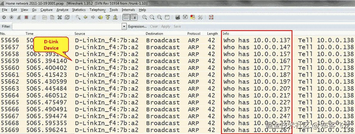 10.0.0.10的流量——这是ip.dst==10.0.0.10过滤器,以红色显示(上面一行)。这是下载(下行)流量的图表。 - 第二张图显示了来自 IP 地址