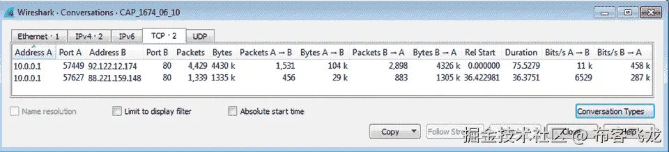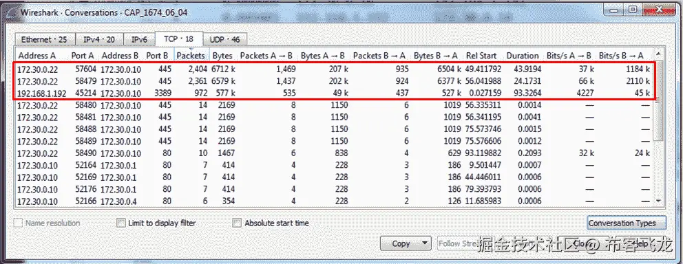 让我们看看统计|对话中的CAP_1674_06_04文件。在该文件中,我们可以看到三个最繁忙的连接如下: