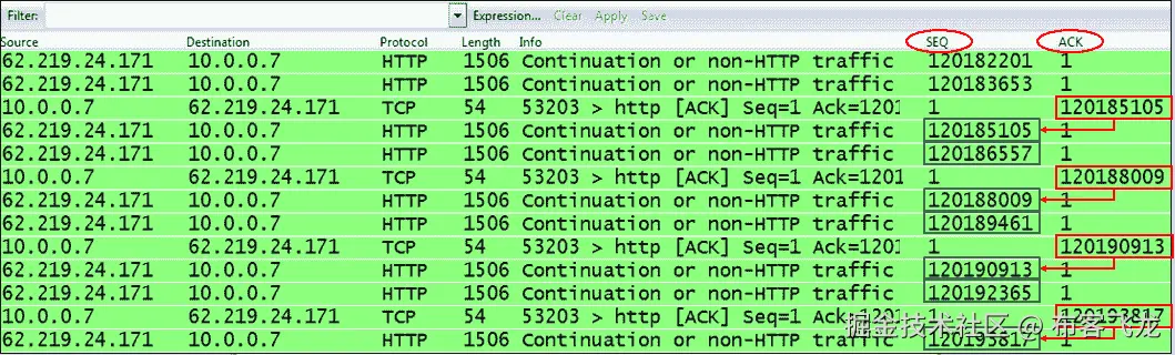 从这里,62.219.24.171发送序列号以85101, 86557结尾的数据包,之后10.0.0.7发回一个 ACK,告诉发送者发送以88009结尾的数据包。然后发送者发送它。诸如此类。