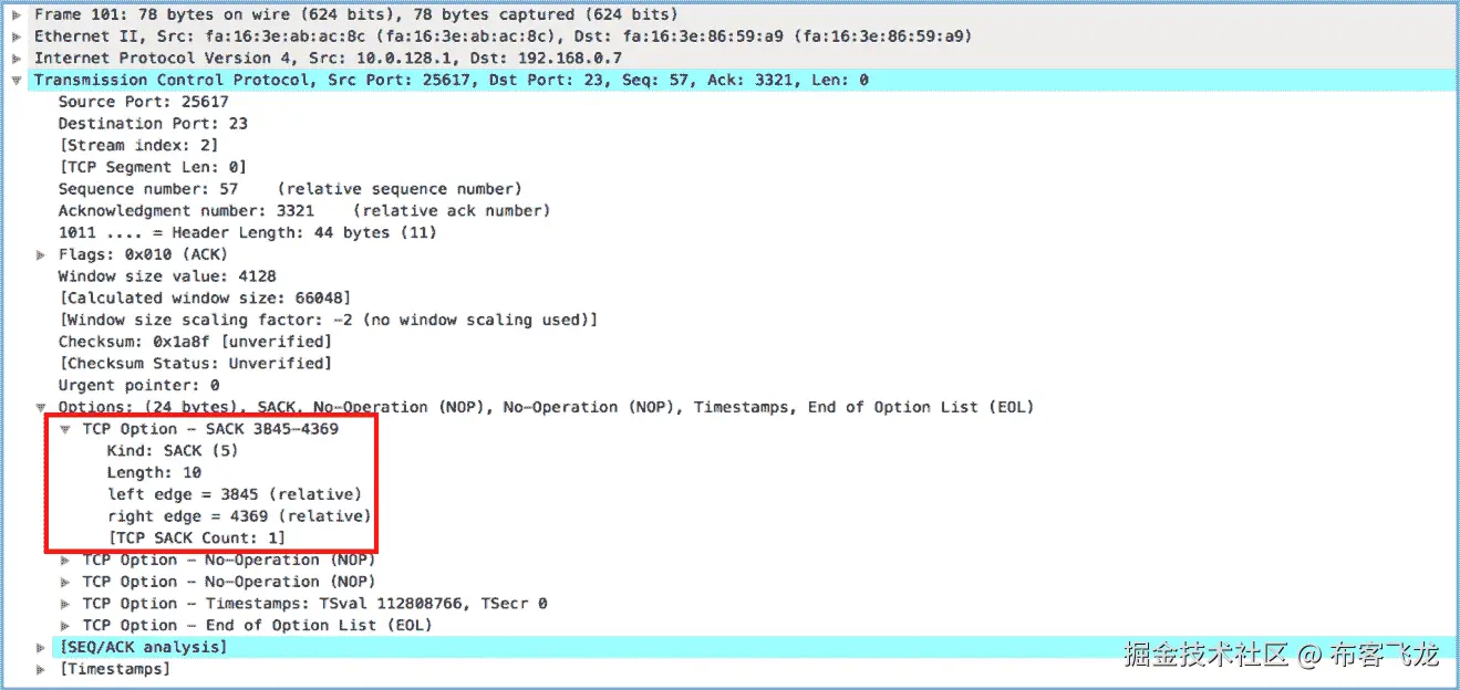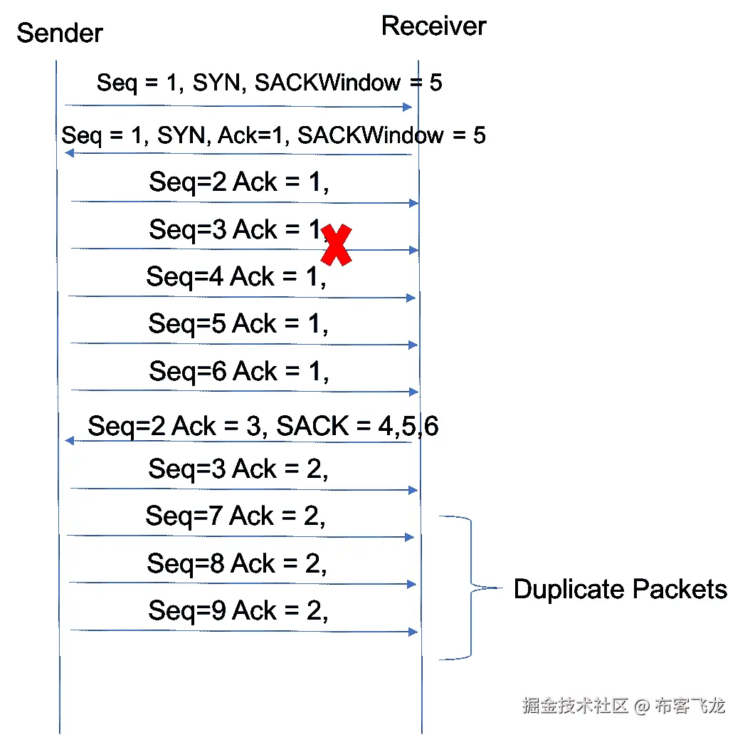 在同一个示例中,发送方和接收方都启用了 TCP SACK。请注意,TCP SACK 将包含在 SYN 数据段中,以向对等方发送信号。使用相同的例子,当接收器没有接收到具有 seq=3 的段时,它发送具有 ack=3 的 ack 段,但是它还包括针对 4、5、6 的选择性 ACK。这将指示发送方只发送丢失的数据段,而不重新传输其他接收到的数据段。这避免了重复,并有助于提供高效的吞吐量。