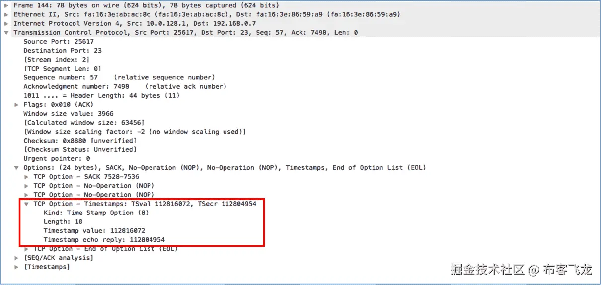 与 TCP SACK 一样,TCP timestamp 是一个 TCP 选项,将包含在 SYN 和 SYN/ACK 数据段中。当 TCP 端点启用了 RTT 测量功能时,端点会向对等方发出在 SYN 数据包中包含 TCP 时间戳的信号。当两个端点都支持此功能时,发送方将在转发给对等方的所有数据段中包含 TCP 时间戳选项。