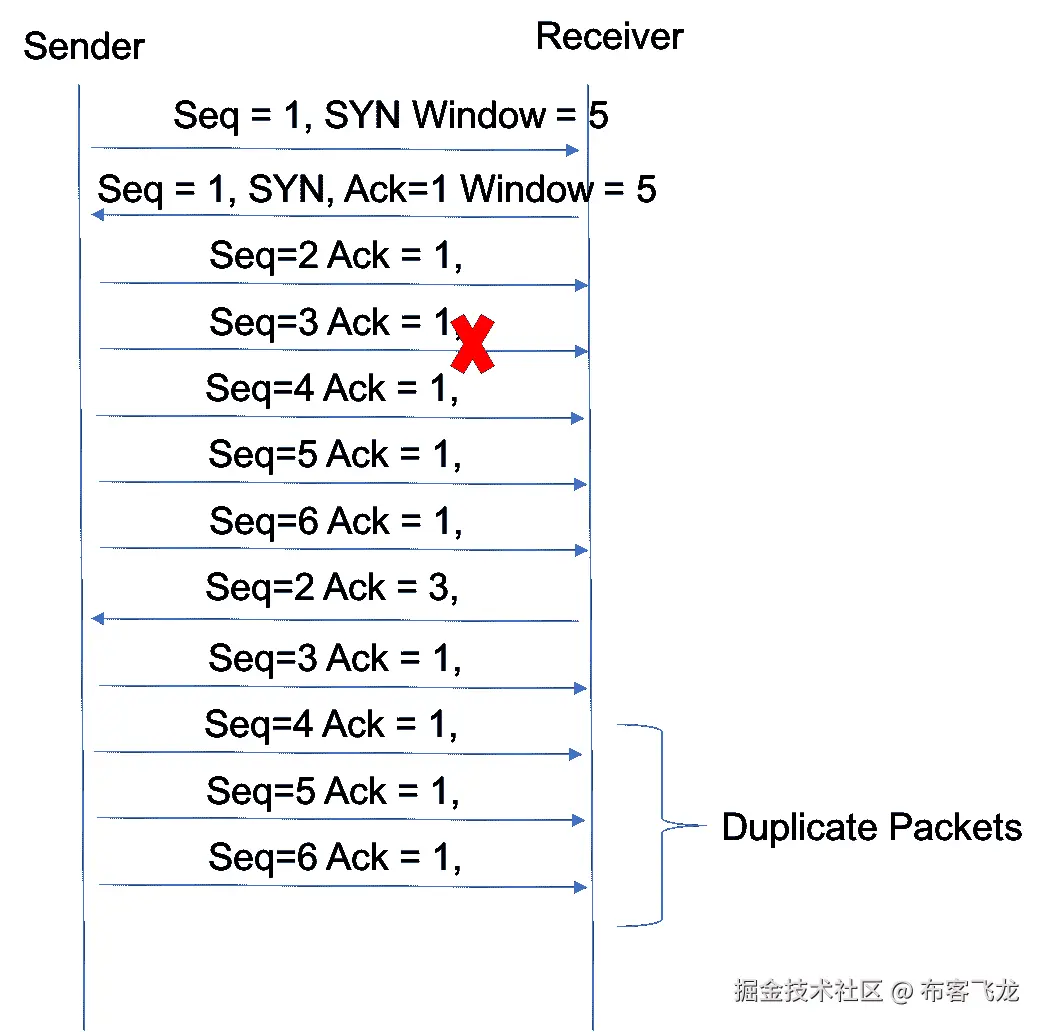 举例来说,我们使用一个窗口大小为五段的 TCP 会话。根据窗口大小,发送方在等待确认之前可以发送五个数据段。因此,它发送五个段,其中 seq=2,3,4,5,6 。接收器已经接收到具有序列=2,4,5,6 的段,但是它没有接收到具有序列=3 的段。发送 ACK 时,接收器发送 ack=3 。如前所述,ender 不仅会重新传输带有 seq=3 的段,还会重新传输窗口中的剩余段。