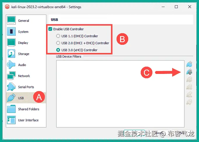 - 在 设置 菜单中,选择 USB 类别,并确保 USB 控制器 模式设置为 USB 2.0 或 USB 3.0,具体取决于主机计算机上物理 USB 端口的类型。然后,点击 USB+ 图标以选择无线网络适配器,如下所示: