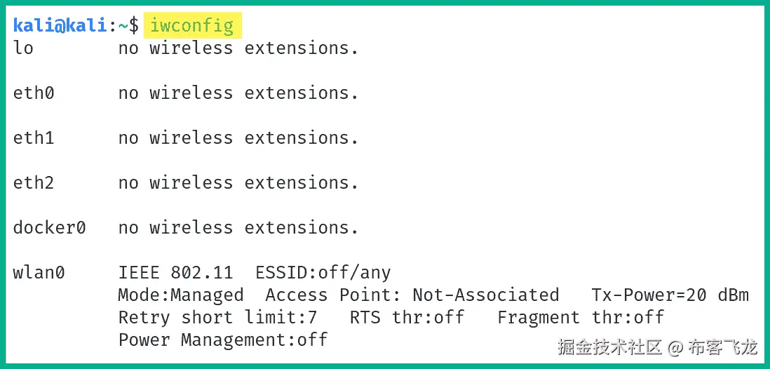 iwconfig命令验证 Kali Linux 是否检测到无线网卡,如下所示: