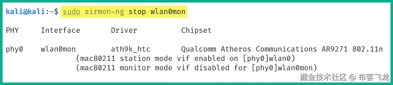 以下截图显示 Airmon-ng 禁用了该接口的监控模式: