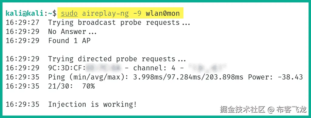 以下截图显示 Aireplay-ng 成功验证了接口支持数据包注入: