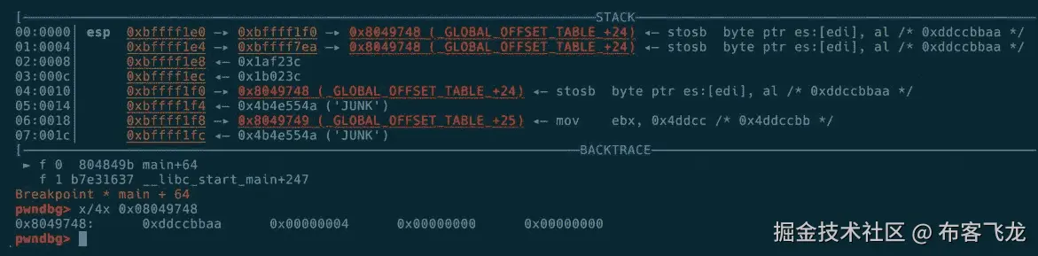 现在putchar@got.plt指针的值为0xddccbbaa,这是我们计划写入其中的值。