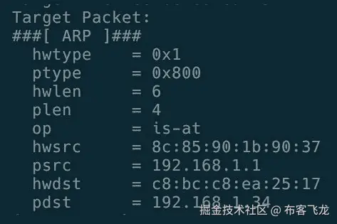 这将sniff接口en0并将其保存到tmp/文件夹中的 pcap 文件中,例如:/tmp/airportSniffXXXXXX.pcap. 我们可以使用 Scapy 分析此文件。
