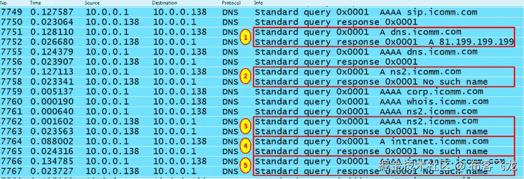 - 对于 DNS 暴力攻击,查找要求您的域下的通用名称的 DNS 查询。例如,在下面的截图中,您可以看到对 ISP 服务器的扫描。我们可以看到对常见名称的 DNS 查询,如 DNS ( 1 )和 DNS ( 2 )、IPv4 的记录( 2 )和 IPv6 的记录( 3 ),以及 intranet—IP v4 的记录( 4 )和 IPv6 的记录( 5 )。