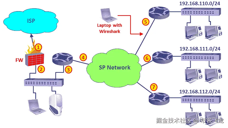- 您还可以在路由器之前( 7 )或之后( 6 )对远程办公室的流量进行端口镜像。
