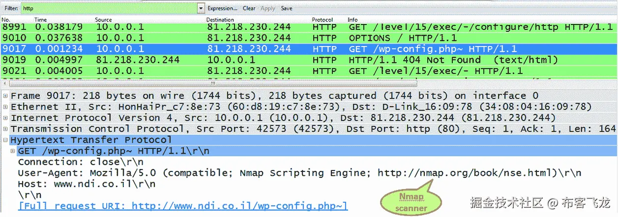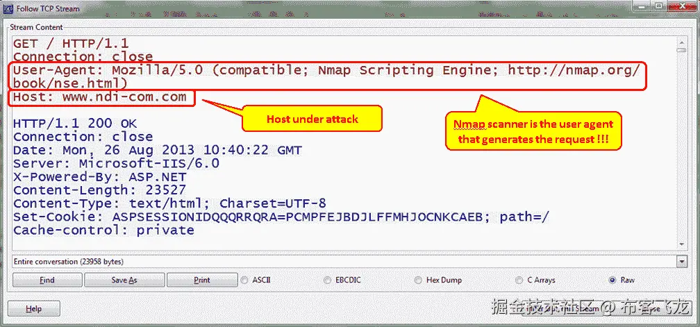 - 要查找 HTTP 扫描,请在数据包详细信息中查找扫描程序的签名,如下图所示。