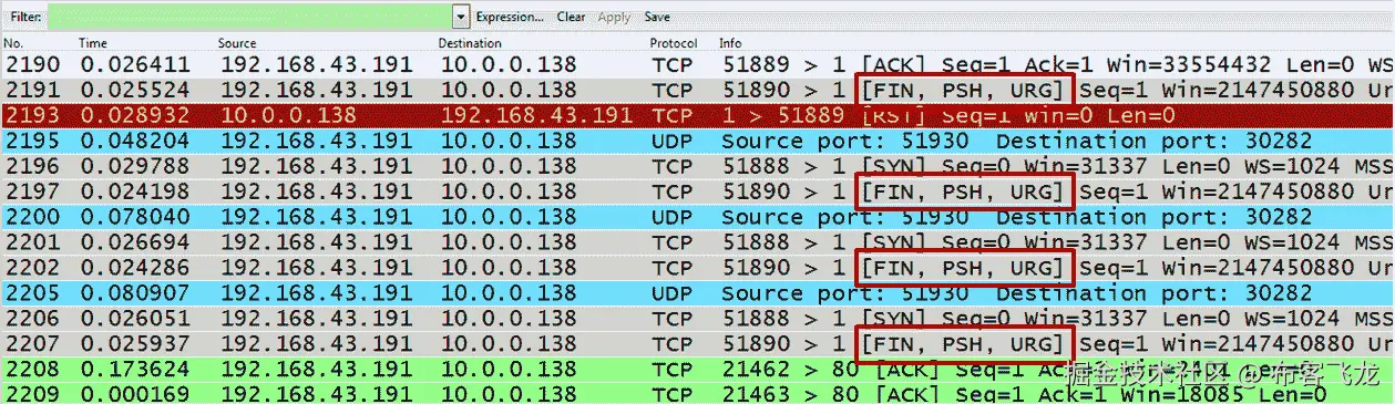 - 不寻常的旗帜组合:这是指任何带有 URG 旗帜、FIN 和 RST、SYN-FIN 等等的组合。不寻常的标志组合不是通常的 SYN、FIN 或 RST,有或没有 ACK。在下面的屏幕截图中,您可以看到这个场景的一个示例。FIN/PSH/URG 操作统称为圣诞扫描。