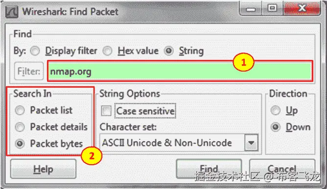 要发现 HTTP 错误代码,请配置显示过滤器http.response.code >= 400 **。**这同样适用于 SIP 和任何使用类似 HTTP 代码的协议。要查找已知的扫描仪,您只需使用编辑|查找数据包功能并查找常见的扫描仪名称。在下面的截图中,你可以看到一个 Nmap 的例子,这是常见的例子之一。我们在包字节(2)中选择了字符串 nmap.org(1)。