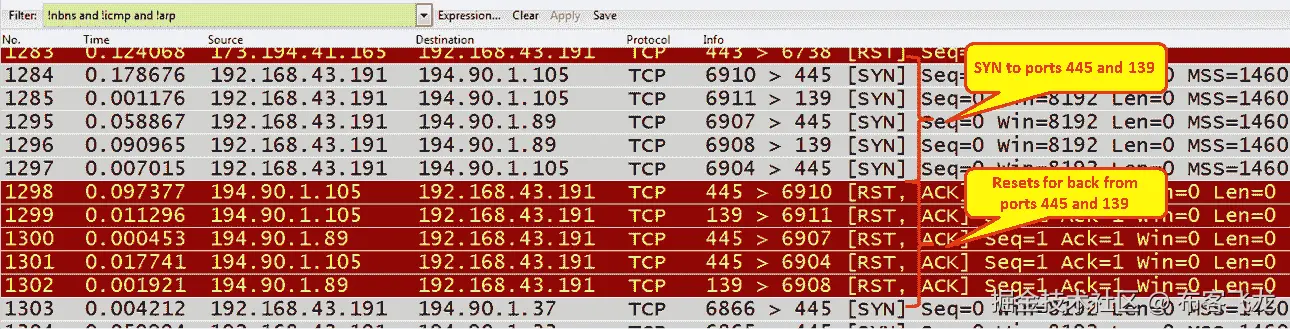 检查 SYN 扫描,并验证它们来自哪个 IP 和 MAC 地址。可能是蠕虫生成的源地址不是主机的地址。
