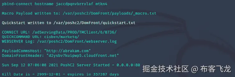 posh-project –n domfront创建一个 PoshC2 项目,然后定位到/var/poshc2/domfront/config.yml并编辑配置文件,将PayLoadCommsHost修改为易受攻击的主机,将DomainFrontHeader修改为您的 AWS 云分发主机名,然后将BindPort设置为80,如图 13.30所示:图 13.30:配置 PoshC2 在端口 80 上运行,并与易受攻击的主机一起使用域前端头