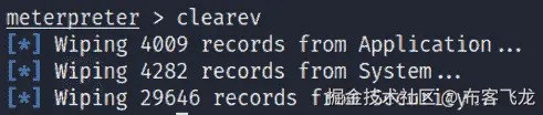 这也可以通过 Meterpreter 提示符使用 clearev 来完成。如 图 13.41 所示,这将清除目标系统的应用程序、系统和安全日志(此命令没有选项或参数):