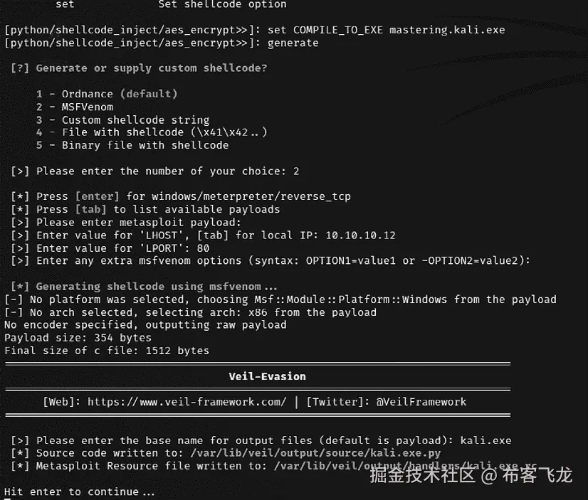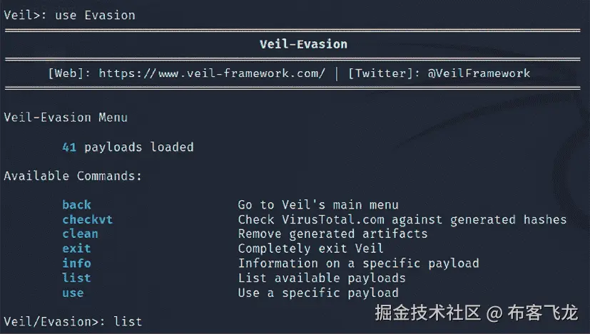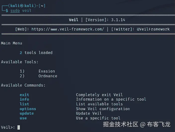 Veil 框架是另一个 AV 规避框架,由 Chris Truncer 编写,名为 Veil-Evasion,提供有效的保护和检测针对终端和服务器的独立漏洞攻击。虽然该框架已被创作者停滞(不再支持),但攻击者仍然可以通过进一步修改工具创建的有效载荷,使其不被检测到。Veil 框架的最新版本为 2021 年 8 月发布的 3.1.14。该框架由两个工具组成:Evasion 和 Ordnance。Veil 框架可以通过 Kali 仓库获得,用户只需在终端中输入sudo apt install veil即可自动安装。