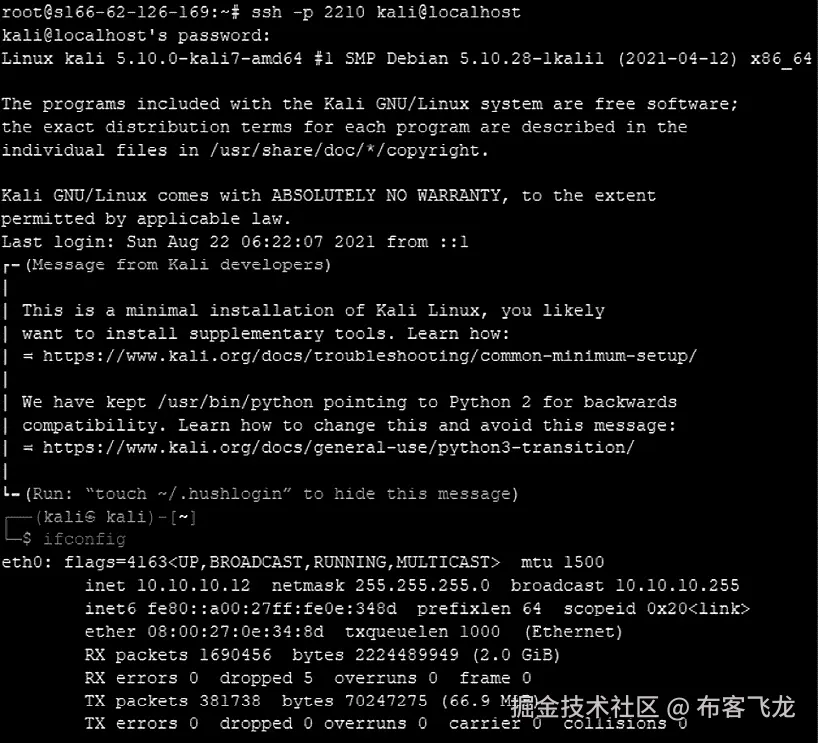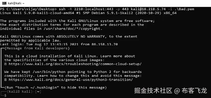 图 9.9 显示了通过 SSH 从内部网络登录到云端机器上的 Kali Linux,该机器已经在本地主机上打开了 2210 端口来转发 SSH:
