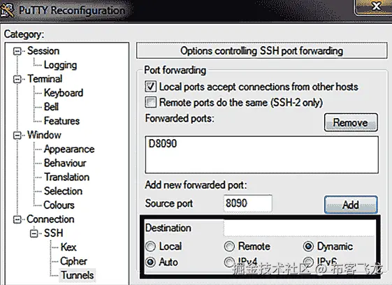 8090,并将远程端口设置为 自动,如 图 9.6 所示:图 9.6:通过现有 SSH 通信设置隧道
