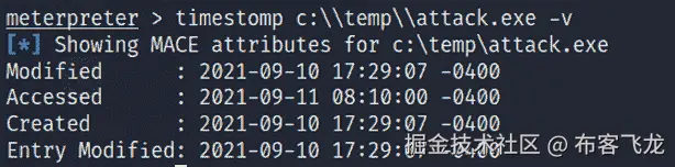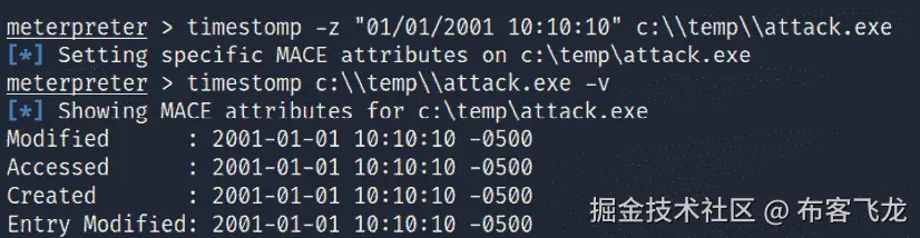 这个解决方案并不完美。很明显,攻击已经发生。此外,时间戳可以保存在硬盘的其他位置,并且可以供调查人员访问。如果目标系统正在通过入侵检测系统(如 Tripwire)主动监控系统完整性的变化,那么时间戳篡改活动会触发警报。因此,当需要真正隐秘的方式时,摧毁时间戳的价值有限。