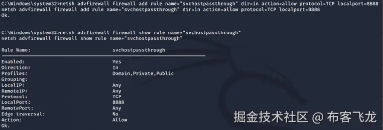 一种非隐蔽的方式是通过运行netsh advfirewall set allprofiles state off,或在较早版本的 Windows 中运行netsh firewall set opmode disable来禁用所有配置文件。