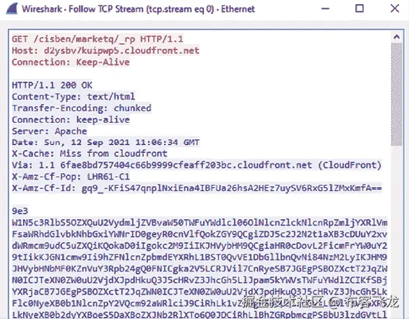 vijayvelu.com主机将域名请求转发到我们的 C2 服务器。在连接到 Amazon Web Services 之前,应用程序将执行 DNS 查找,将域名解析为网络 IP 地址。请求将直接发送到vijayvelu.com主机,并带有我们在 Amazon CloudFront 分发中创建的主机头。从 Wireshark 捕获的请求数据包将类似于图 13.32: