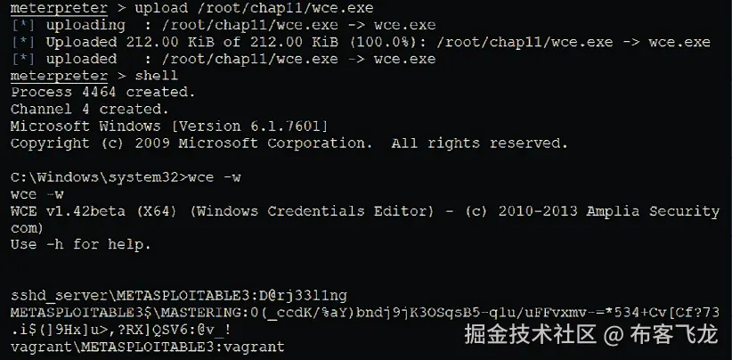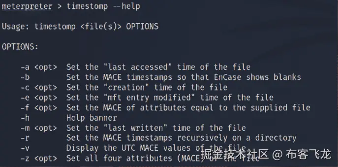Metasploit 还有一个额外的技巧:timestomp 选项允许攻击者修改文件的 MACE 参数(文件的最后修改时间、访问时间、创建时间和 MFT 条目修改时间)。一旦系统被攻破并且建立了 Meterpreter shell,可以调用 timestomp,如 图 13.42 所示: