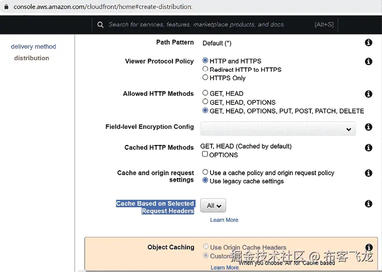 允许的 HTTP 方法:在默认缓存行为设置中选择GET、HEAD、OPTIONS、PUT、POST、PATCH、DELETE。