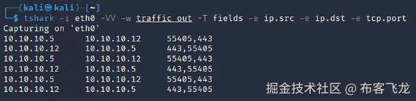 使用Ctrl + C关闭tcpdump。下一步是从pcap文件中删除不需要的数据,以便我们通过运行 Wireshark 或tshark仅将特定的十六进制值打印到文本文件中。
