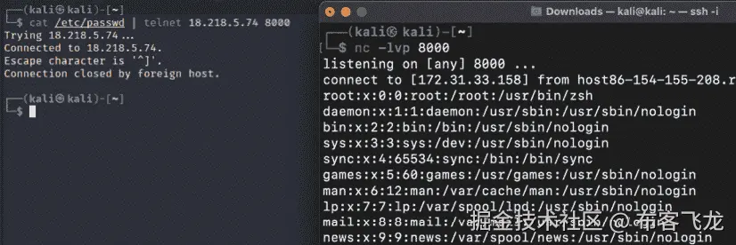 图 13.35:使用 Telnet 从本地 Kali 系统到远程 Kali 系统的数据外泄