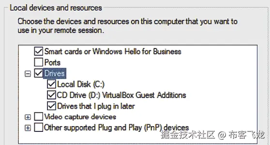 这可以通过进入远程桌面连接,选择显示选项,然后选择本地资源,接着选择本地设备和资源,点击更多,最后选择你想挂载的驱动器来实现,如图 13.36所示: