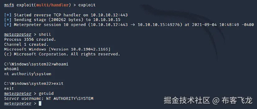 图 13.34:当在目标系统上使用域前置技术运行漏洞时,反向 Shell 到 Meterpreter