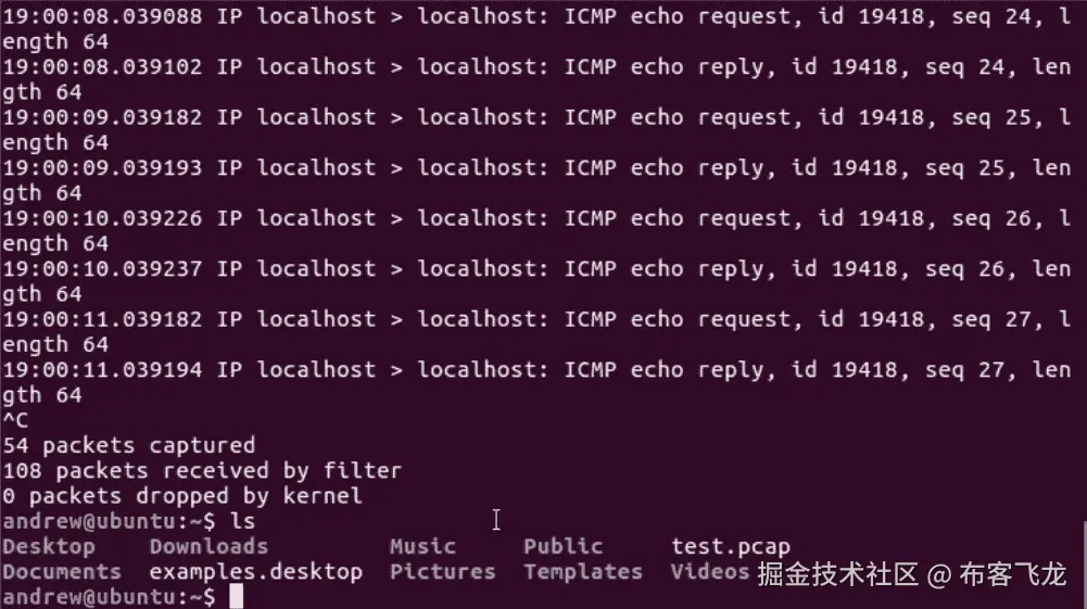现在,我们将开放一个新的终端,我将产生一些流量。我就简单的ping我的localhost。localhost作为127.0.0.1的别名,这是我的环回地址。当我 ping 回送时,你会看到在tcpdump窗口中弹出: