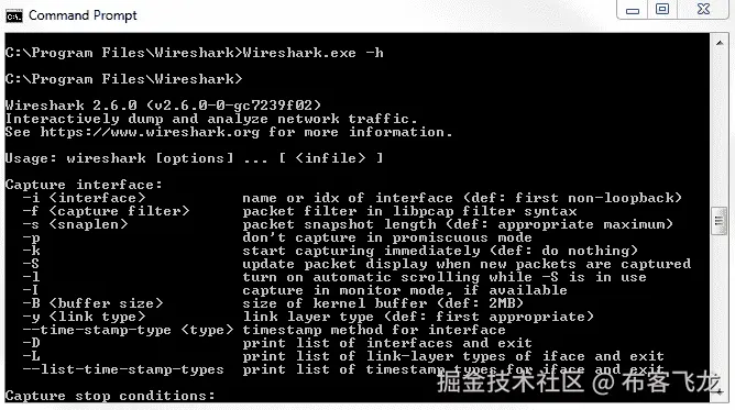 我们要做的是运行Wireshark.exe;然后,如果你按下回车,它将打开 Wireshark,就像你点击图标一样。如果您键入Wireshark.exe -h,它将提供 Wireshark 可用的所有变量和参数的输出: