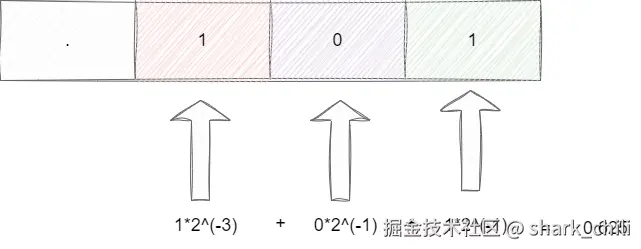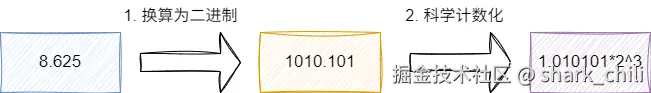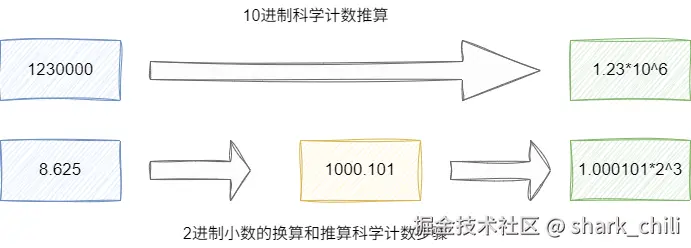 同理上文,8.625得到的二进制值为1000.101,参照十进制的计算方式我们也可以得出科学计数法结果为1.000101*2(^3)(小数点向左移动三位变小了,所以需要*2(^3)):