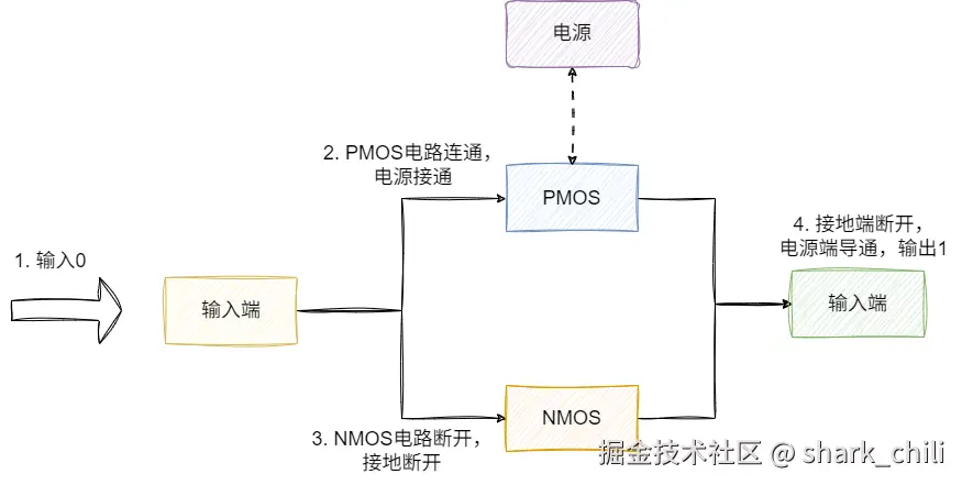 基于上述电路符号的基础上,我们将二者结合,NMOS接地、PMOS接电源,试想这样我们输入数字1: