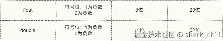float使用二进制32位也就是4个字节,double用二进制64位表示也就是8个字节,下图便是它们存储带有小数的数值的内存空间划分,读者可以先行了解一下,后文会针对以float进行推算演示: