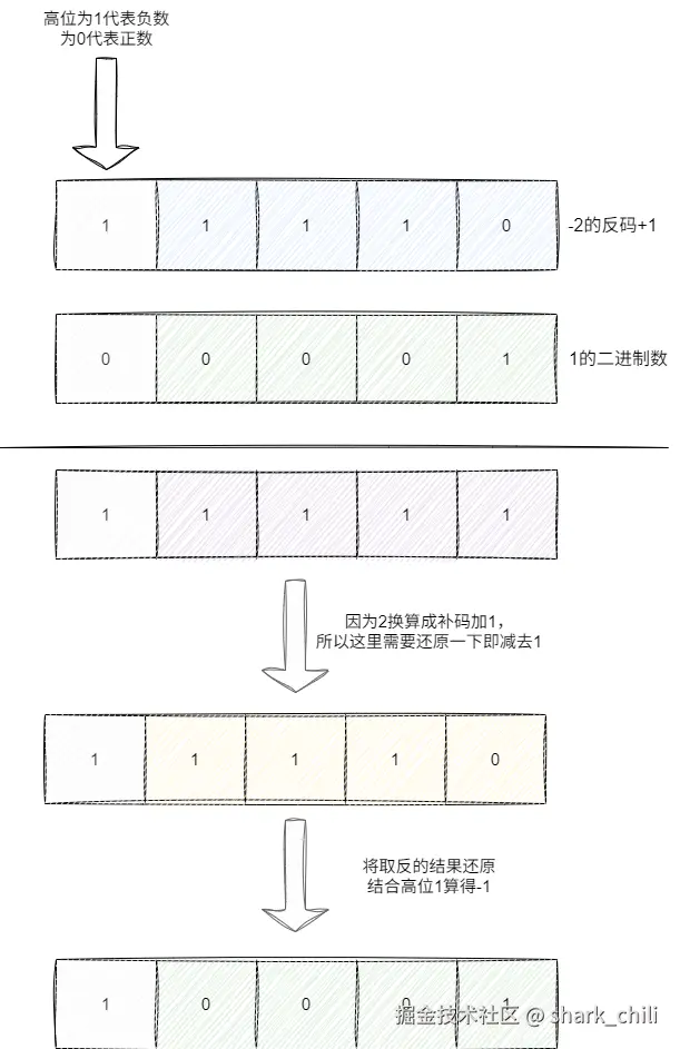 - 因为之前算补码时+1,此时就需要-1还原,算得1110