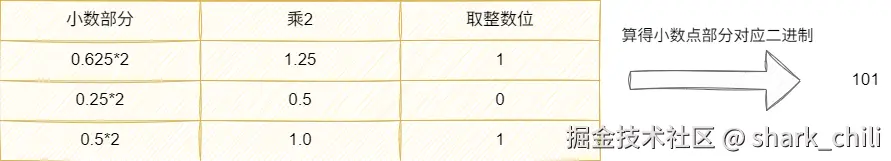 0.625*2经过计算得到1.25取整数位1- 接步骤2得到的小数0.25继续乘2,得到0.5,整数位取0