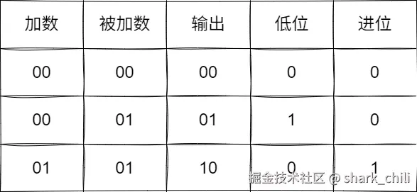 最终我们将这些数字的二进制运算转换为如下图所示的表格,我们以1+1为例,可以看到输出二进制结果为10,对应的低位为0,而进位为1,由此得出10。