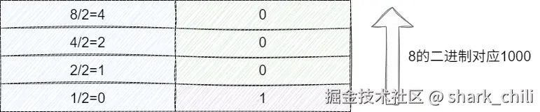 上文提及在计算机中数据都采用二进制表示,对应我们也给出十进制数8的换算过程复习一下二进制的推算过程,如下所示,对应十进制换算二进制的方式本质上就是通过不断整除直到结果为0为止: