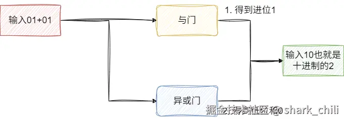 0+0=0即二进制的00+00,最终输出二进制结果为000+1=1即二进制中的00+01,最终输出二进制结果为011+1=2即二进制中的01+01,最终输出二进制结果为10