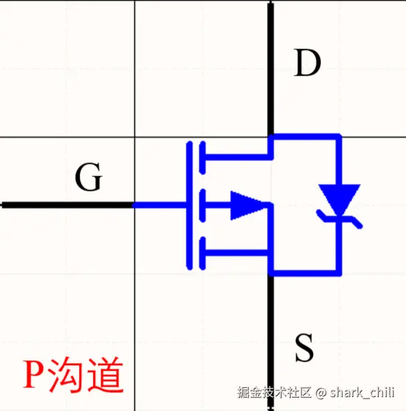 PMOS则相反,可以看到寄生二极管从漏极指向源极避免源极无条件流向漏极,因为PMOS是P型MOS管(P即positive),其工作机制与NMOS相反: