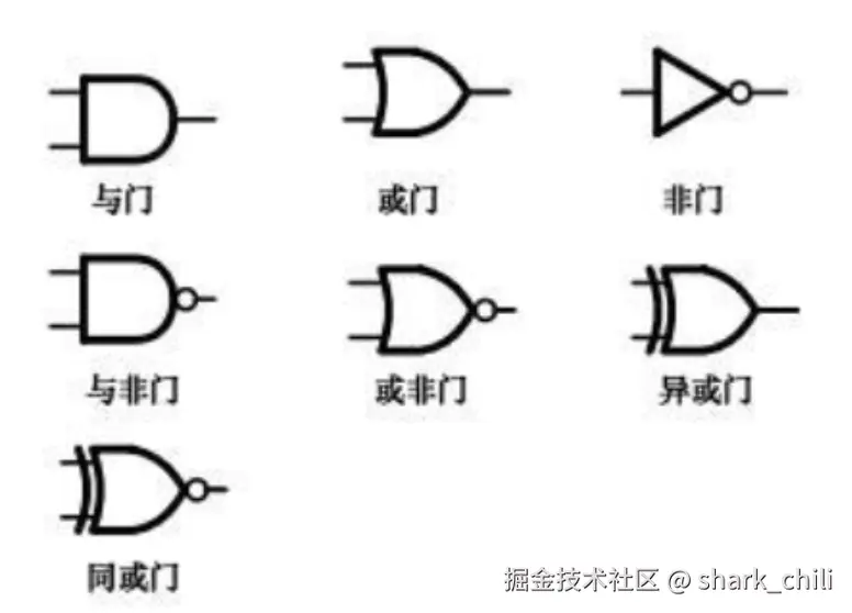 由此可知,输出结果与输入结果相反,就生成二进制中的非运算,而上述的组合我们也称之为非门。同理,设计者们基于NMOS和PMOS这两种晶体管搭建出各种各样的门电路: