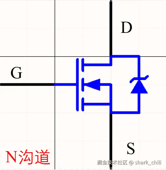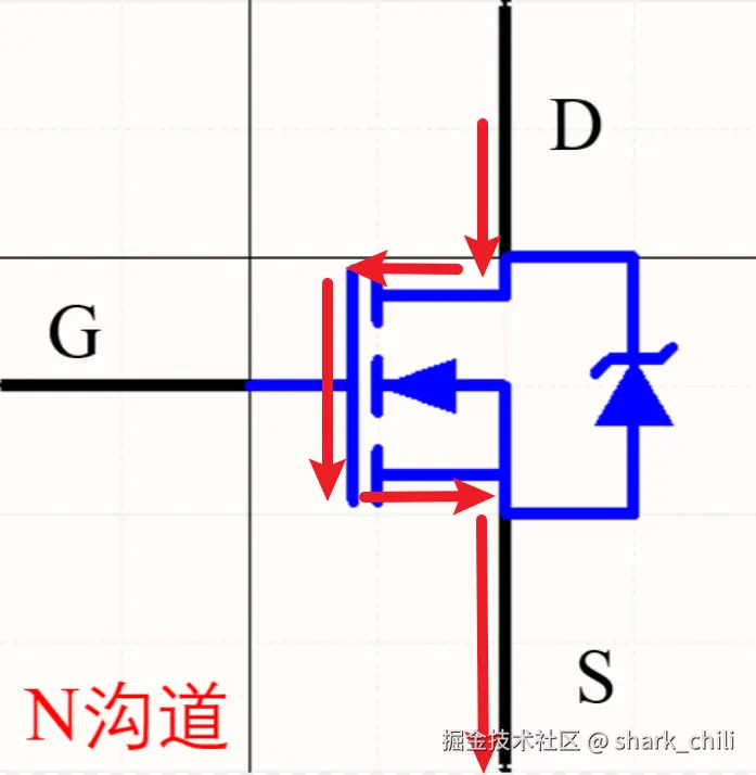 基于NMOS而言,从语义上来理解,它是N型MOS管(N即negative),所以它的电流控制方式是:当栅极输入高电平(1)时,NMOS导通,电流可以从漏极流向源极;当栅极输入低电平(0)时,NMOS截止,电流无法流通。下图中寄生二极管(即右边的箭头)的朝向是由源极(S)到漏极(D),这样可以避免漏极电流无条件从漏极流向源极。NMOS的工作机制为: