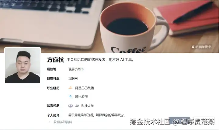 我姓方,叫方应杭,2012年毕业于华中科技大学。职业生涯一共有13年左右的时间,曾经在腾讯、阿里工作过,还有一段大概七年的创业时间。最近两年回武汉定居,目前在武汉做前端开发。