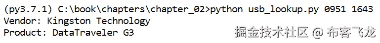 该函数调用usb_lookup.search_key()函数,传入处理过的在线 USB 字典以及一个包含设备 VID 和 PID 的两元素列表,分别作为第一个和第二个元素。.search_key()函数返回一个响应匹配项,如果没有匹配项,则返回Unknown字符串。这些数据以元组形式返回,并分配给第 161 行的device_name变量。接着,我们将在第 165 和 166 行将这两个解析后的值拆分为device_info字典的新键。一旦我们扩展了device_info,就可以将其返回,以便打印到控制台。请参见以下行: