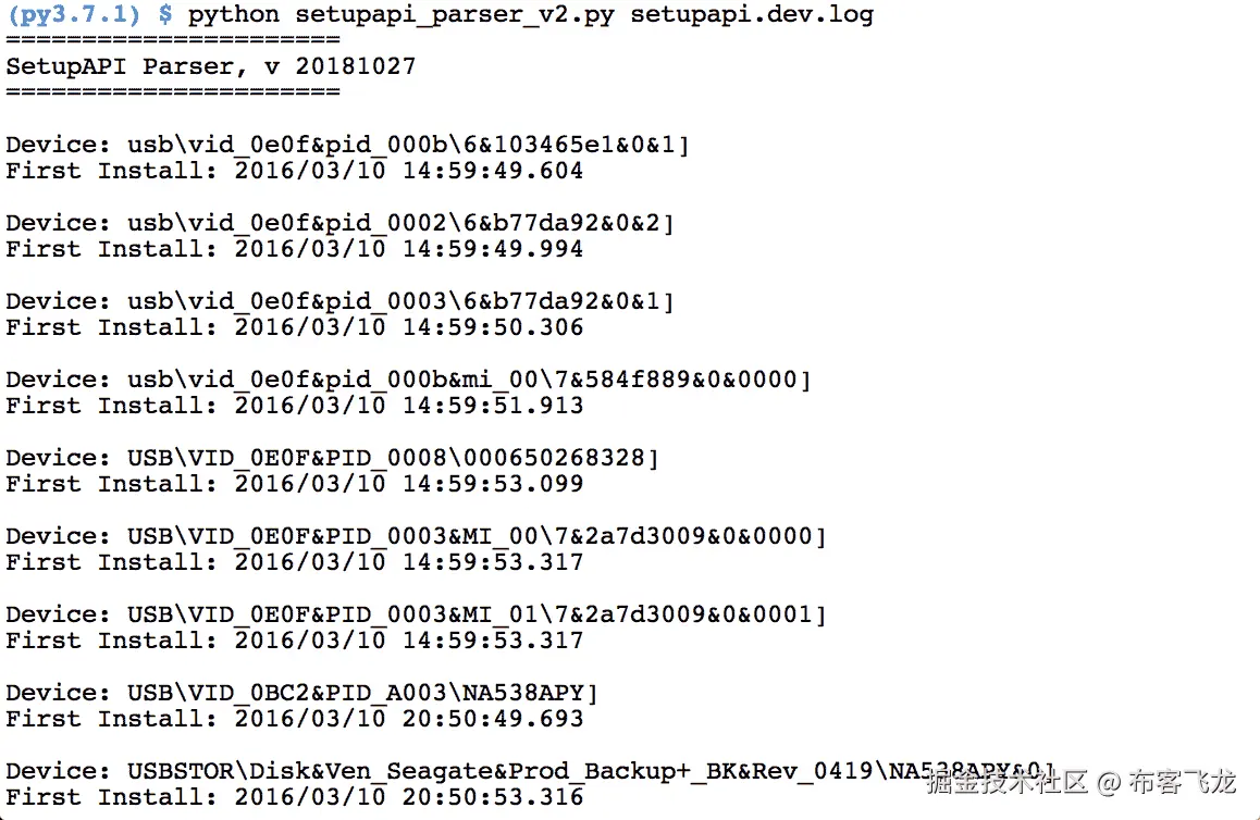 在第 127 行,我们使用 if 语句来判断 vid 或 pid 是否在初始化后获得了值,并在第 128 至 132 行构建一个字典,若这些值未填写,我们返回原始字符串,以允许输出没有额外格式化的条目,如第 134 行所示,确保我们没有因格式化错误而遗漏任何数据: